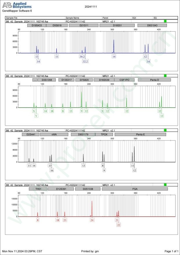 Amelogenin X, Y CSF1PO 12 D2S1338 24 D3S1358 14,18 D5S818 11 D7S820 9,12 D8S1179 13 D13S317 8,13 D16S539 9,12 D18S51 14 D19S433 13,14 D21S11 30.2,32.2 FGA 21,22 PentaD 12,13 PentaE 11,12 TH01 8 TPOX 8,9 vWA 15,16 D6S1043 12,14 D12S391 18,23 D2S441 11,14 -