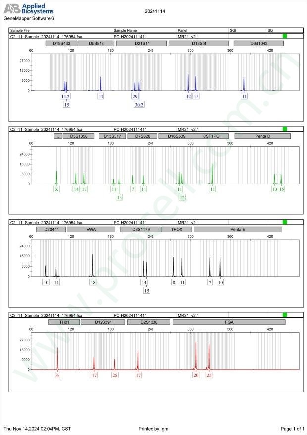 Amelogenin X CSF1PO 11 D2S1338 17 D3S1358 14,17 D5S818 13 D7S820 7,11 D8S1179 14,15 D13S317 11,13 D16S539 11,12 D18S51 12,15 D19S433 14.2,15 D21S11 29,30.2 FGA 20,25 PentaD 13,15 PentaE 7,10 TH01 6 TPOX 8,11 vWA 18 D6S1043 11 D12S391 17,25 D2S441 10,14 -