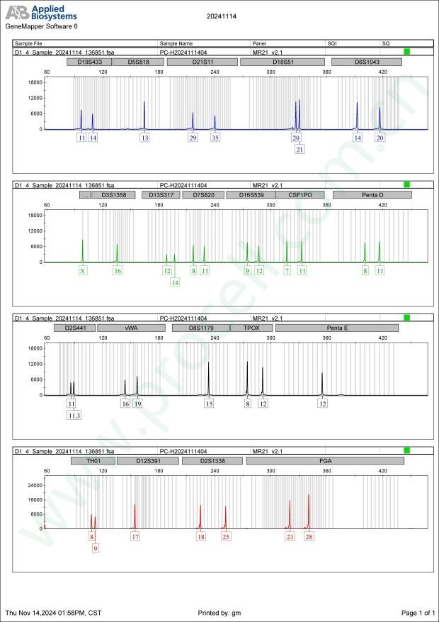 Amelogenin X CSF1PO 7,11 D2S1338 18,25 D3S1358 16 D5S818 13 D7S820 8,11 D8S1179 15 D13S317 12,14 D16S539 9,12 D18S51 20,21 D19S433 11,14 D21S11 29,35 FGA 23,28 PentaD 8,11 PentaE 12 TH01 8,9 TPOX 8,12 vWA 16,19 D6S1043 14,20 D12S391 17 D2S441 11,11.3 -