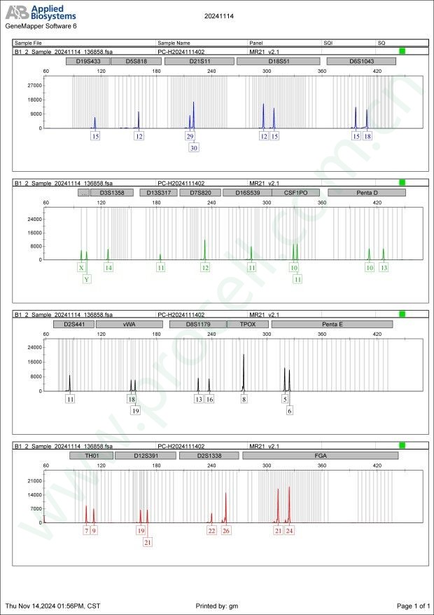 Amelogenin X, Y CSF1PO 10,11 D2S1338 22,26 D3S1358 14 D5S818 12 D7S820 12 D8S1179 13,16 D13S317 11 D16S539 11 D18S51 12,15 D19S433 15 D21S11 29,30 FGA 21,24 PentaD 10,13 PentaE 5,6 TH01 7,9 TPOX 8 vWA 18,19 D6S1043 15,18 D12S391 19,21 D2S441 11 -