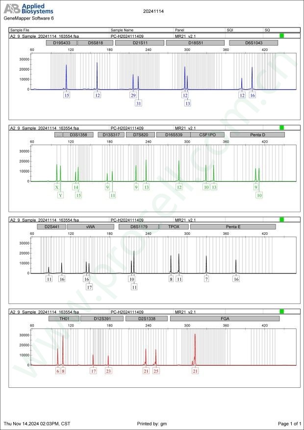 Amelogenin X, Y CSF1PO 10,13 D2S1338 21,25 D3S1358 14,15 D5S818 12 D7S820 9,13 D8S1179 10,11 D13S317 9,11 D16S539 12 D18S51 12,13 D19S433 15 D21S11 29,31 FGA 21 PentaD 9,10 PentaE 7,16 TH01 6,8 TPOX 8,11 vWA 16,17 D6S1043 12,16 D12S391 17,23 D2S441 11,16 -