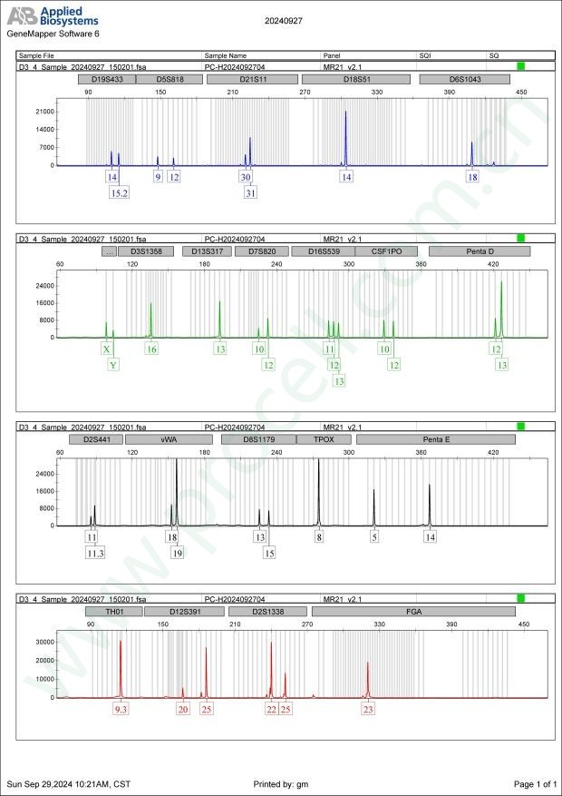 Amelogenin X, Y CSF1PO 10,12 D2S1338 22,25 D3S1358 16 D5S818 9,12 D7S820 10,12 D8S1179 13,15 D13S317 13 D16S539 11,12,13 D18S51 14 D19S433 14,15.2 D21S11 30,31 FGA 23 PentaD 12,13 PentaE 5,14 TH01 9.3 TPOX 8 vWA 18,19 D6S1043 18 D12S391 20,25 D2S441 11,11.3 -