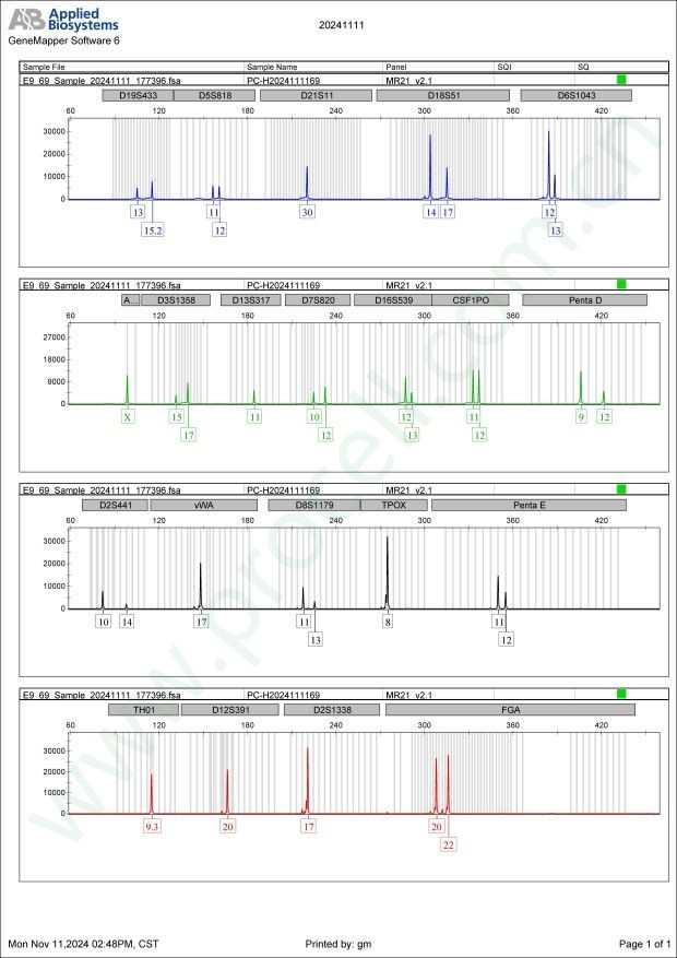 Amelogenin X CSF1PO 11,12 D2S1338 17 D3S1358 15,17 D5S818 11,12 D7S820 10,12 D8S1179 11,13 D13S317 11 D16S539 12,13 D18S51 14,17 D19S433 13,15.2 D21S11 30 FGA 20,22 PentaD 9,12 PentaE 11,12 TH01 9.3 TPOX 8 vWA 17 D6S1043 12,13 D12S391 20 D2S441 10,14 -