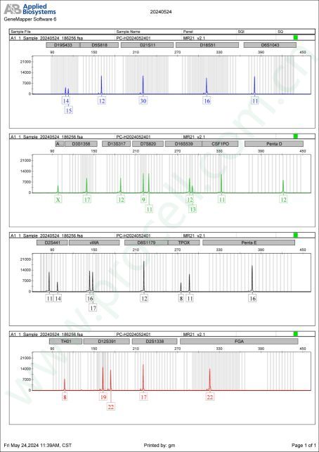 Amelogenin X CSF1PO 11 D2S1338 17 D3S1358 17 D5S818 12 D7S820 9,11 D8S1179 12 D13S317 12 D16S539 12,13 D18S51 16 D19S433 14,15 D21S11 30 FGA 22 PentaD 12 PentaE 16 TH01 8 TPOX 8,11 vWA 16,17 D6S1043 11 D12S391 19,22 D2S441 11,14 -