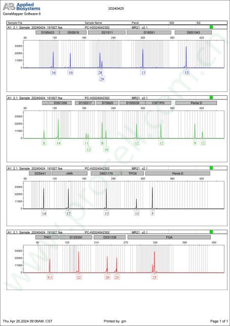 Amelogenin X CSF1PO 12 D2S1338 20,25 D3S1358 14 D5S818 10 D7S820 8,10 D8S1179 13 D13S317 11,12 D16S539 12 D18S51 13 D19S433 16 D21S11 28,29 FGA 25 PentaD 9,12 PentaE 5 TH01 9.3 TPOX 11 vWA 17 D6S1043 13 D12S391 22 D2S441 14 -