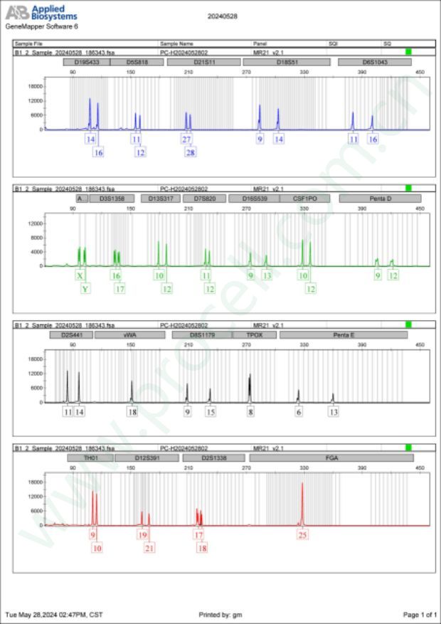 Amelogenin X, Y CSF1PO 10,12 D2S1338 17,18 D3S1358 16,17 D5S818 11,12 D7S820 11,12 D8S1179 9,15 D13S317 10,12 D16S539 9,13 D18S51 9,14 D19S433 14,16 D21S11 27,28 FGA 25 PentaD 9,12 PentaE 6,13 TH01 9,10 TPOX 8 vWA 18 D6S1043 11,16 D12S391 19,21 D2S441 11,14 -