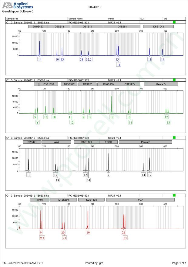 Amelogenin X, Y CSF1PO 10,11 D2S1338 19 D3S1358 13,18 D5S818 10,13 D7S820 8,12 D8S1179 12,14 D13S317 11,12 D16S539 12 D18S51 13,14 D19S433 14 D21S11 28,32.2 FGA 22,23 PentaD 12,13 PentaE 14,17 TH01 9,9.3 TPOX 9 vWA 17,18 D6S1043 11,19 D12S391 20,21 D2S441 10 -