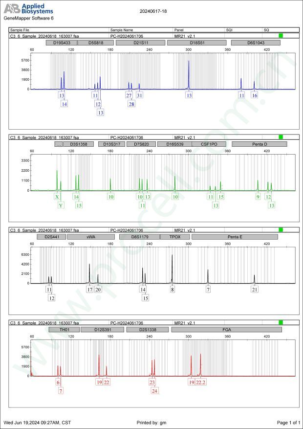 Amelogenin X, Y CSF1PO 11,13,15 D2S1338 23,24 D3S1358 14,15 D5S818 11,12,13 D7S820 10,11,13 D8S1179 14,15 D13S317 10 D16S539 10 D18S51 13 D19S433 13,14 D21S11 27,28,31 FGA 19,22.2 PentaD 9,12,13 PentaE 7,12 TH01 6,7 TPOX 8 vWA 17,20 D6S1043 11,16 D12S391 19,22 D2S441 11,22 -