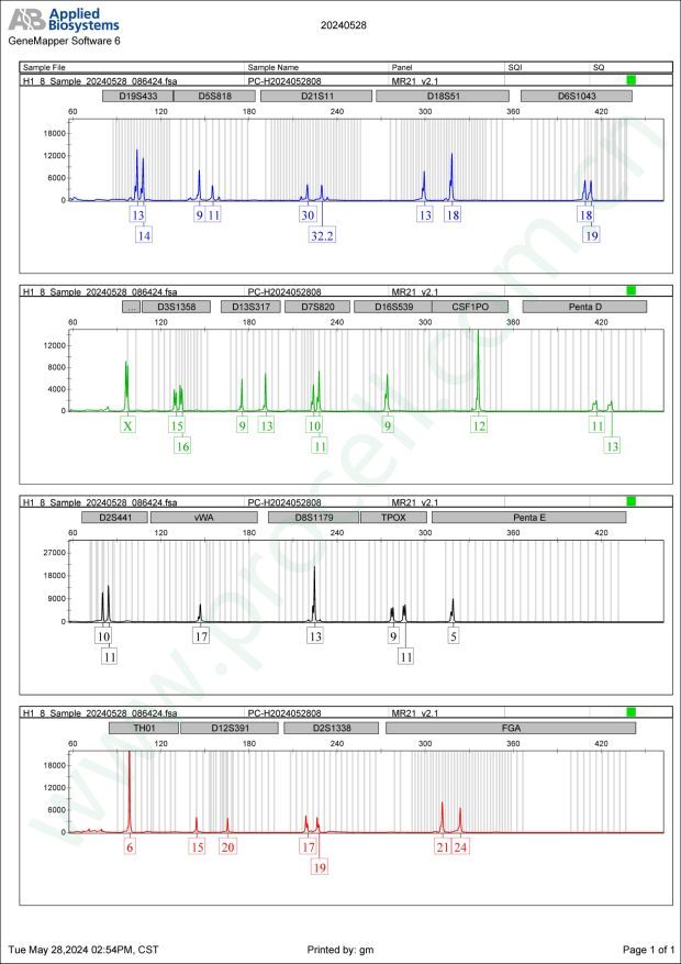 Amelogenin X CSF1PO 12 D2S1338 17,19 D3S1358 15,16 D5S818 9,11 D7S820 10,11 D8S1179 13 D13S317 9,13 D16S539 9 D18S51 13,18 D19S433 13,14 D21S11 30,32.2 FGA 21,24 PentaD 11,13 PentaE 5 TH01 6 TPOX 9,11 vWA 17 D6S1043 18,19 D12S391 15,20 D2S441 10,11 -