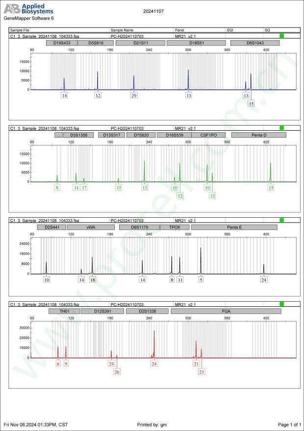 Amelogenin X CSF1PO 10,12 D2S1338 24 D3S1358 14,17 D5S818 12 D7S820 12 D8S1179 14 D13S317 13 D16S539 10,12 D18S51 13 D19S433 14 D21S11 29 FGA 21,23 PentaD 13 PentaE 5,24 TH01 6,9 TPOX 8,11 vWA 14,18 D6S1043 13,15 D12S391 24,26 D2S441 10 -