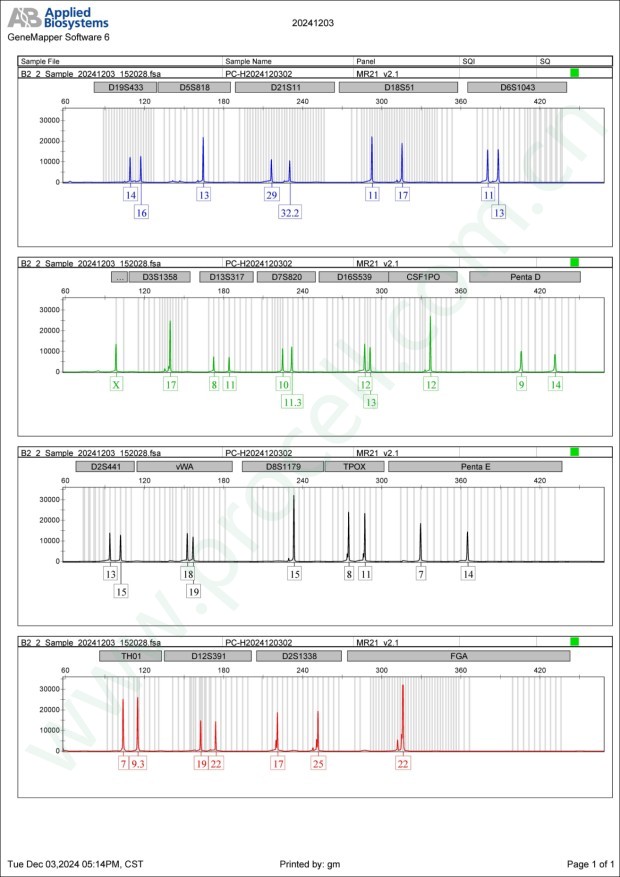 Amelogenin X CSF1PO 12 D2S1338 17,25 D3S1358 17 D5S818 13 D7S820 10,11.3 D8S1179 15 D13S317 8,11 D16S539 12,13 D18S51 11,17 D19S433 14,16 D21S11 29,32.2 FGA 22 PentaD 9,14 PentaE 7,14 TH01 7,9.3 TPOX 8,11 vWA 18,19 D6S1043 11,13 D12S391 19,22 D2S441 13,15 -