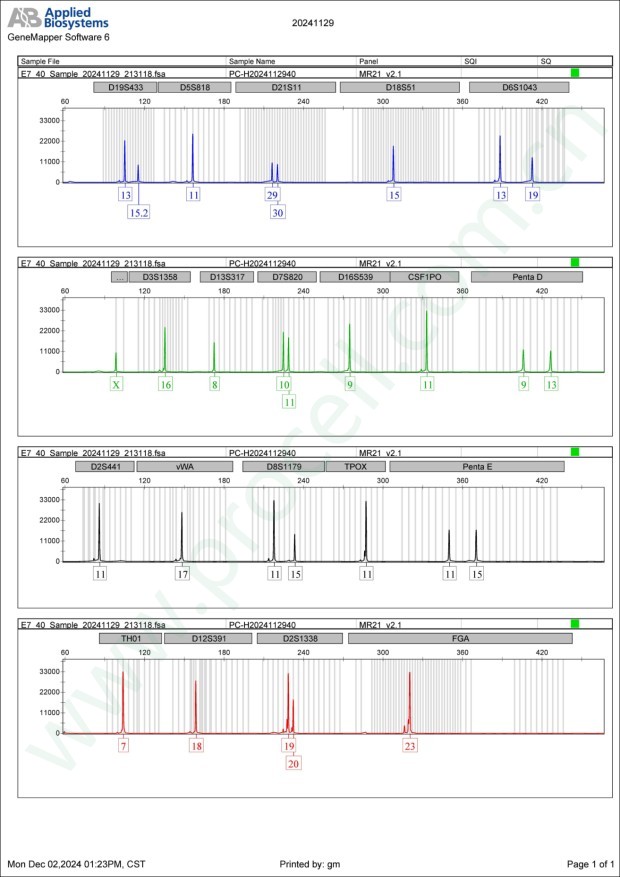 Amelogenin X CSF1PO 11 D2S1338 19,20 D3S1358 16 D5S818 11 D7S820 10,11 D8S1179 11,15 D13S317 8 D16S539 9 D18S51 15 D19S433 13,15.2 D21S11 29,30 FGA 23 PentaD 9,13 PentaE 11,15 TH01 7 TPOX 11 vWA 17 D6S1043 13,19 D12S391 18 D2S441 11 -