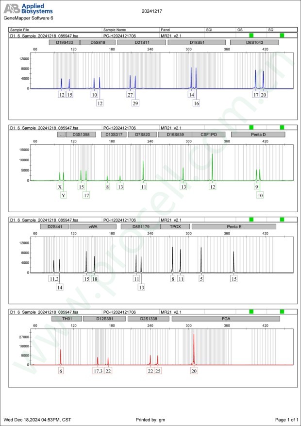 Amelogenin X,Y CSF1PO 12 D2S1338 22,25 D3S1358 15,17 D5S818 10,12 D7S820 11 D8S1179 11,13 D13S317 8,13 D16S539 13 D18S51 14,16 D19S433 12,15 D21S11 27,29 FGA 20 PentaD 9,10 PentaE 5,15 TH01 6 TPOX 8,11 vWA 15,18 D6S1043 17,20 D12S391 17.3,22 D2S441 11.3,14 -