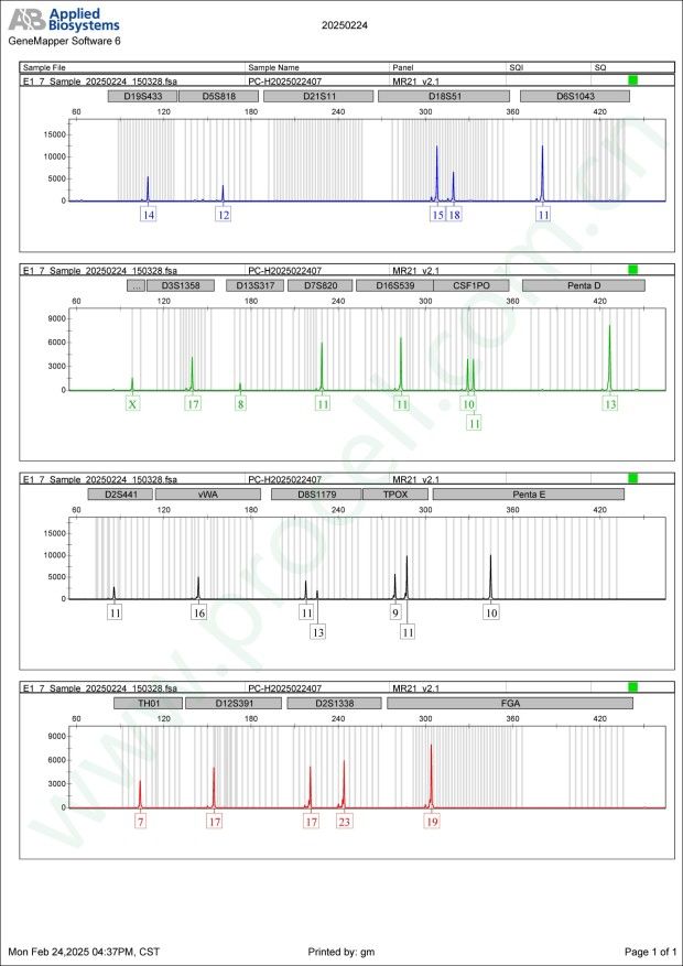 Amelogenin X CSF1PO 10,11 D2S1338 17,23 D3S1358 17 D5S818 12 D7S820 11 D8S1179 11,13 D13S317 8 D16S539 11 D18S51 15,18 D19S433 14 FGA 19 PentaD 13 PentaE 10 TH01 7 TPOX 9,11 vWA 16 D6S1043 11 D12S391 17 D2S441 11 -