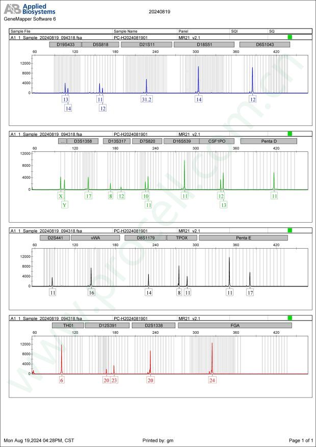 Amelogenin X,Y CSF1PO 12,13 D2S1338 20 D3S1358 17 D5S818 11,12 D7S820 10,11 D8S1179 14 D13S317 8,12 D16S539 11 D18S51 14 D19S433 13,14 D21S11 31.2 FGA 24 PentaD 11 PentaE 11,17 TH01 6 TPOX 8,11 vWA 16 D6S1043 12 D12S391 20,23 D2S441 11 -
