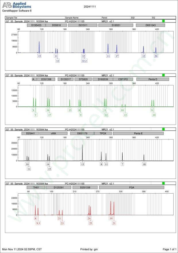 Amelogenin X,Y CSF1PO 10,12 D2S1338 24,25 D3S1358 16,17 D5S818 11,12 D7S820 8,9 D8S1179 13 D13S317 13 D16S539 11,12 D18S51 11,17 D19S433 15 D21S11 32,32.2 FGA 19,21 PentaD 9,10 PentaE 7,18 TH01 8,9.3 TPOX 8,11 vWA 14,15 D6S1043 12,20 D12S391 21,23 D2S441 10,11 -
