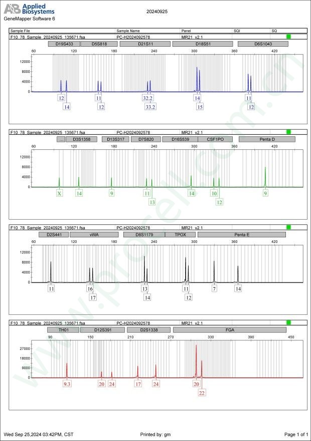 Amelogenin X CSF1PO 10,12 D2S1338 17,24 D3S1358 14 D5S818 11,12 D7S820 11,13 D8S1179 13,14 D13S317 9 D16S539 14 D18S51 14,15 D19S433 12,14 D21S11 32.2,33.2 FGA 20,22 PentaD 9 PentaE 7,14 TH01 9.3 TPOX 11,12 vWA 16,17 D6S1043 11,12 D12S391 20,24 D2S441 11 -
