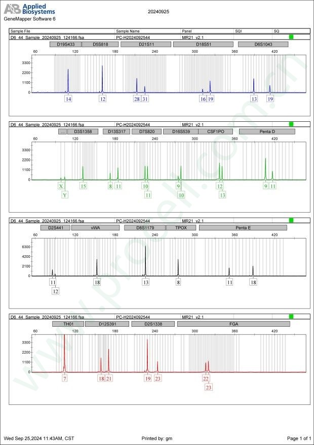 Amelogenin X,Y CSF1PO 12,13 D2S1338 19,23 D3S1358 15 D5S818 12 D7S820 10,11 D8S1179 13 D13S317 8,11 D16S539 9,10 D18S51 16,19 D19S433 14 D21S11 28,31 FGA 22,23 PentaD 9,11 PentaE 11,18 TH01 7 TPOX 8 vWA 18 D6S1043 13,19 D12S391 18,21 D2S441 11,12 -