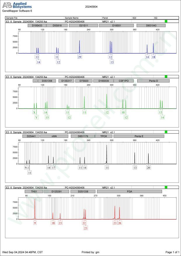 Amelogenin X,Y CSF1PO 10,12 D2S1338 22,23 D3S1358 14,15 D5S818 11,12 D7S820 11 D8S1179 11,14 D13S317 11,12 D16S539 12 D18S51 12,13 D19S433 13,14 D21S11 29 FGA 23,26 PentaD 13,14 PentaE 13,20 TH01 9 TPOX 11 vWA 14,17 D6S1043 14,18 D12S391 18,23 D2S441 9.1,11 -