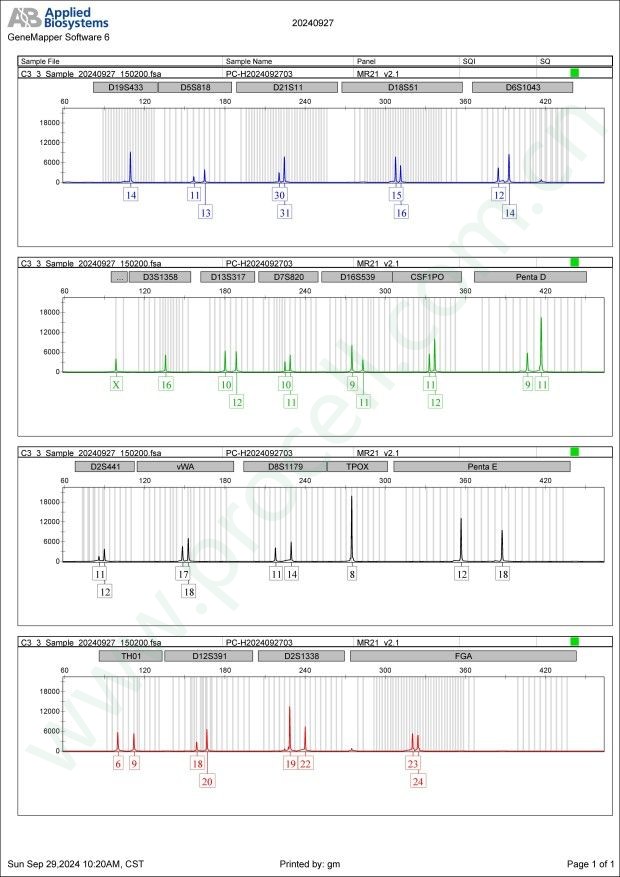 Amelogenin X CSF1PO 11,12 D2S1338 19,22 D3S1358 16 D5S818 11,13 D7S820 10,11 D8S1179 11,14 D13S317 10,12 D16S539 9,11 D18S51 15,16 D19S433 14 D21S11 30,31 FGA 23,24 PentaD 9,11 PentaE 12,18 TH01 6,9 TPOX 8 vWA 17,18 D6S1043 12,14 D12S391 18,20 D2S441 11,12 -