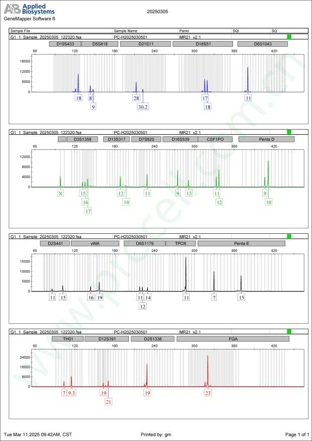 Amelogenin X CSF1PO 11,12 D2S1338 19 D3S1358 15,16,17 D5S818 8,9 D7S820 11 D8S1179 11,12,14 D13S317 12,14 D16S539 9,13 D18S51 17,18 D19S433 18 D21S11 28,30.2 FGA 23 PentaD 9,10 PentaE 7,15 TH01 7,9.3 TPOX 11 vWA 16,19 D6S1043 11 D12S391 19,21 D2S441 11,15 -