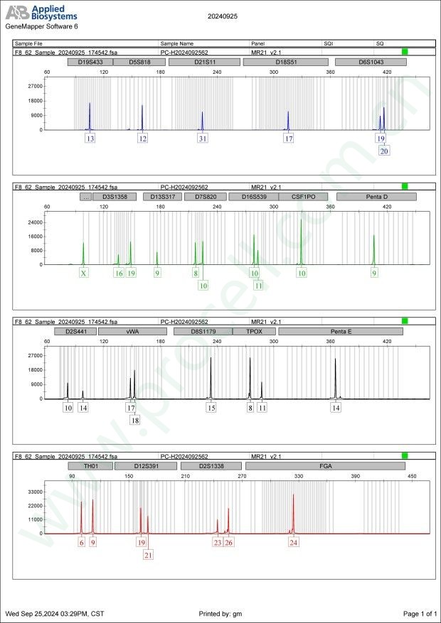 Amelogenin X CSF1PO 10 D2S1338 23,26 D3S1358 16,19 D5S818 12 D7S820 8,10 D8S1179 15 D13S317 9 D16S539 10,11 D18S51 17 D19S433 13 D21S11 31 FGA 24 PentaD 9 PentaE 14 TH01 6,9 TPOX 8,11 vWA 17,18 D6S1043 19,20 D12S391 19,21 D2S441 10,14 -