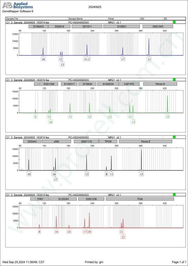 Amelogenin X CSF1PO 11,13 D2S1338 17,20 D3S1358 15,16 D5S818 12,13 D7S820 12 D8S1179 13 D13S317 11 D16S539 11 D18S51 17 D19S433 16 D21S11 31.2 FGA 21,22 PentaD 13 PentaE 13 TH01 8 TPOX 8,11 vWA 16,17 D6S1043 11 D12S391 16,24 D2S441 10 -
