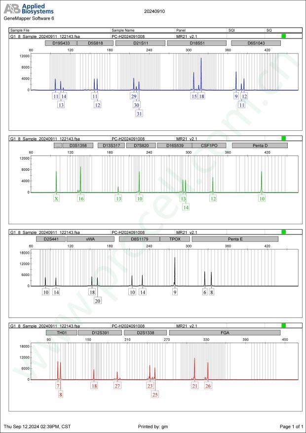 Amelogenin X CSF1PO 12 D2S1338 23,25 D3S1358 16 D5S818 11,12 D7S820 10 D8S1179 10,14 D13S317 13 D16S539 13,14 D18S51 15,18 D19S433 11,13,14 D21S11 29,30,31 FGA 21,26 PentaD 10 PentaE 6,8 TH01 7,8 TPOX 9 vWA 18,20 D6S1043 9,11,12 D12S391 18,27 D2S441 10,14 -