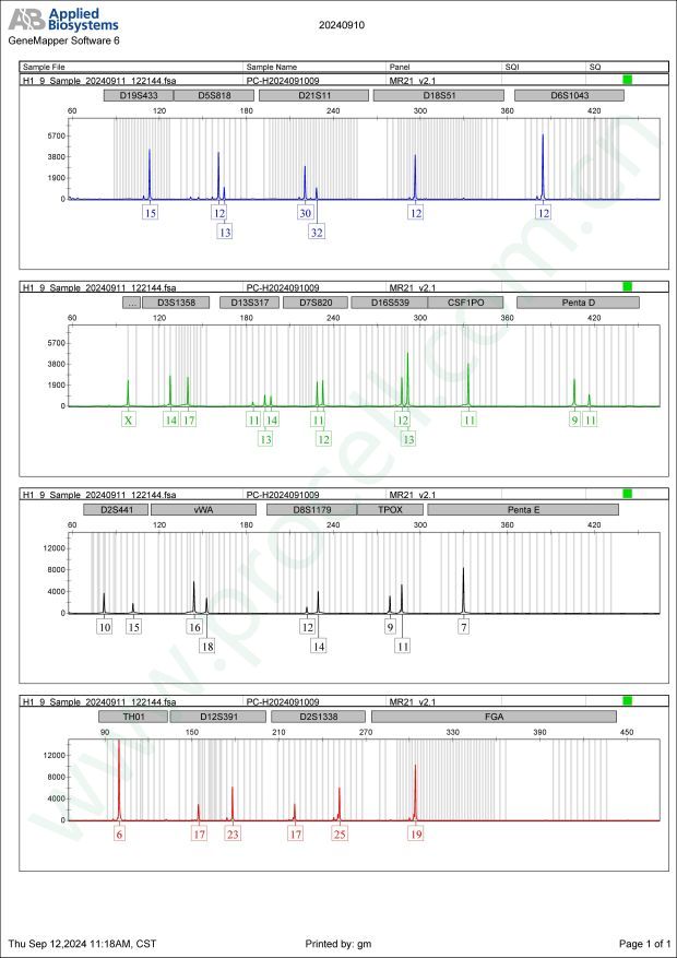 Amelogenin X CSF1PO 11 D2S1338 17,25 D3S1358 14,17 D5S818 12,13 D7S820 11,12 D8S1179 12,14 D13S317 11,13,14 D16S539 12,13 D18S51 12 D19S433 15 D21S11 30,32 FGA 19 PentaD 9,11 PentaE 7 TH01 6 TPOX 9,11 vWA 16,18 D6S1043 12 D12S391 17,23 D2S441 10,15 -
