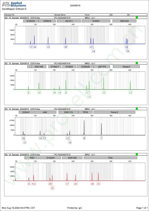 Amelogenin X CSF1PO 12 D2S1338 17,24 D3S1358 15 D5S818 12 D7S820 8 D8S1179 12,14 D13S317 10,14 D16S539 11,13 D18S51 12,14 D19S433 13,16 D21S11 29 FGA 18,23 PentaD 12 PentaE 7 TH01 6,9.3 TPOX 8 vWA 14,17 D6S1043 18,19 D12S391 20,22 D2S441 10,11 -