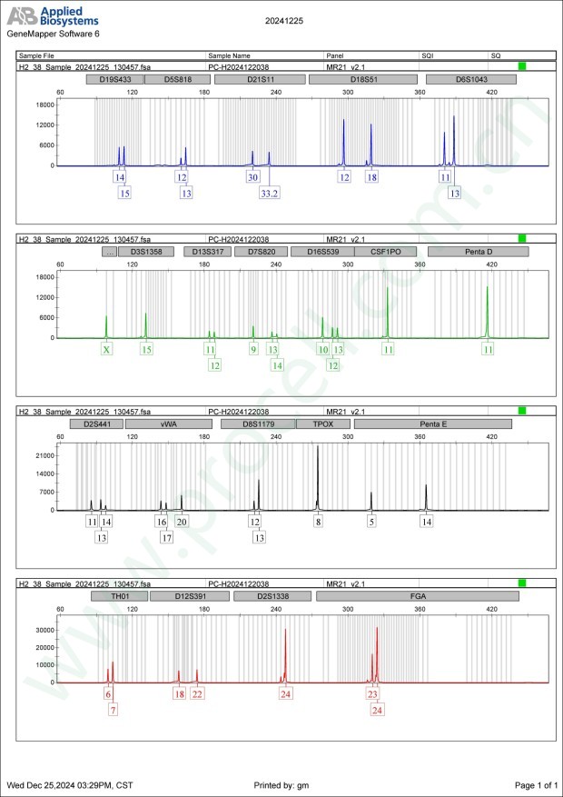 Amelogenin X CSF1PO 11 D2S1338 24 D3S1358 15 D5S818 12,13 D7S820 9,13,14 D8S1179 12,13 D13S317 11,12 D16S539 10,12,13 D18S51 12,18 D19S433 14,15 D21S11 30,32.2 FGA 23,24 PentaD 11 PentaE 5,14 TH01 6,7 TPOX 8 vWA 16,17,20 D6S1043 11,13 D12S391 18,22 D2S441 11,13,14 -