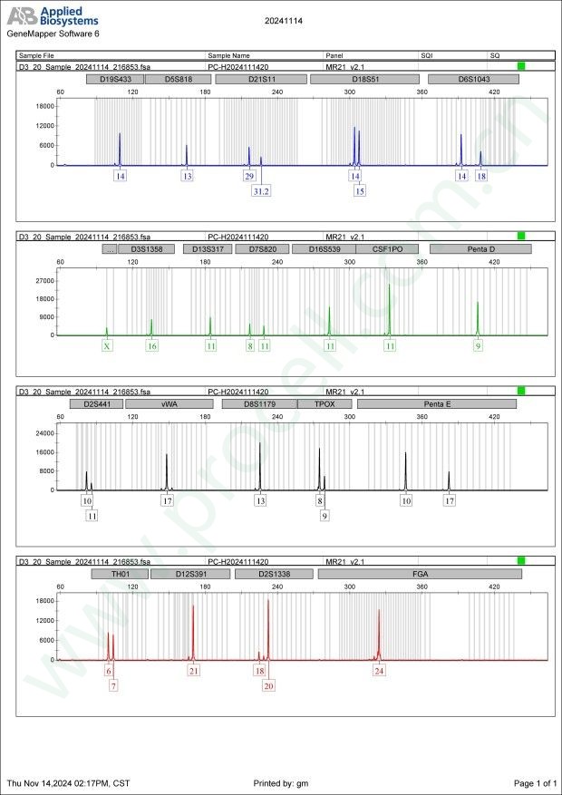 Amelogenin X CSF1PO 11 D2S1338 18,20 D3S1358 16 D5S818 13 D7S820 8,11 D8S1179 13 D13S317 11 D16S539 11 D18S51 14,15 D19S433 14 D21S11 29,31.2 FGA 24 PentaD 9 PentaE 10,17 TH01 6,7 TPOX 8,9 vWA 17 D6S1043 14,18 D12S391 21 D2S441 10,11 -