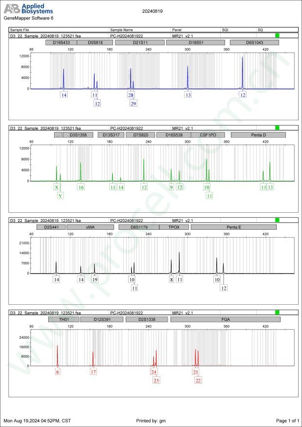 Amelogenin X,Y CSF1PO 10,11 D2S1338 24,25 D3S1358 16 D5S818 11,12 D7S820 12 D8S1179 10,11 D13S317 11,14 D16S539 9,12 D18S51 13 D19S433 14 D21S11 28,29 FGA 21,22 PentaD 11,13 PentaE 10,12 TH01 6 TPOX 8,11 vWA 14,19 D6S1043 12 D12S391 17 D2S441 14 -
