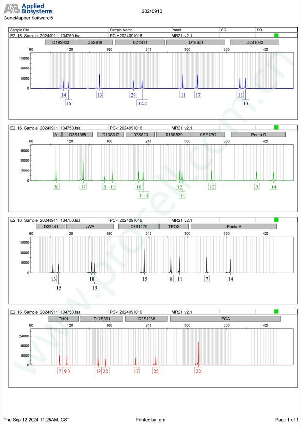 Amelogenin X CSF1PO 12 D2S1338 17,25 D3S1358 17 D5S818 13 D7S820 10,11.3 D8S1179 15 D13S317 8,11 D16S539 12,13 D18S51 11,17 D19S433 14,16 D21S11 29,32.2 FGA 22 PentaD 9,14 PentaE 7,14 TH01 7,9.3 TPOX 8,11 vWA 18,19 D6S1043 11,13 D12S391 19,22 D2S441 13,15 -