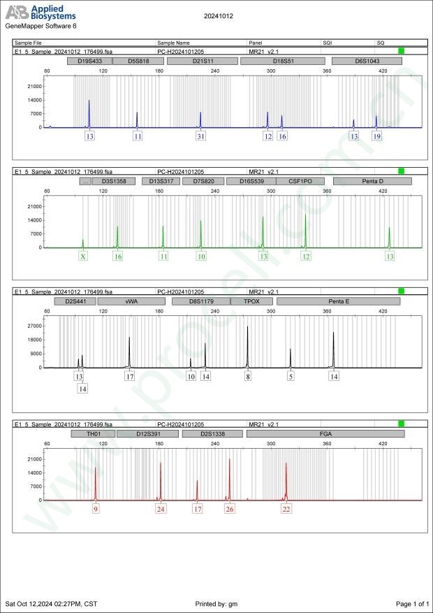 Amelogenin X CSF1PO 12 D2S1338 17,26 D3S1358 16 D5S818 11 D7S820 10 D8S1179 10,14 D13S317 11 D16S539 13 D18S51 12,16 D19S433 13 D21S11 31 FGA 22 PentaD 13 PentaE 5,14 TH01 9 TPOX 8 vWA 17 D6S1043 13,19 D12S391 24 D2S441 13,14 -