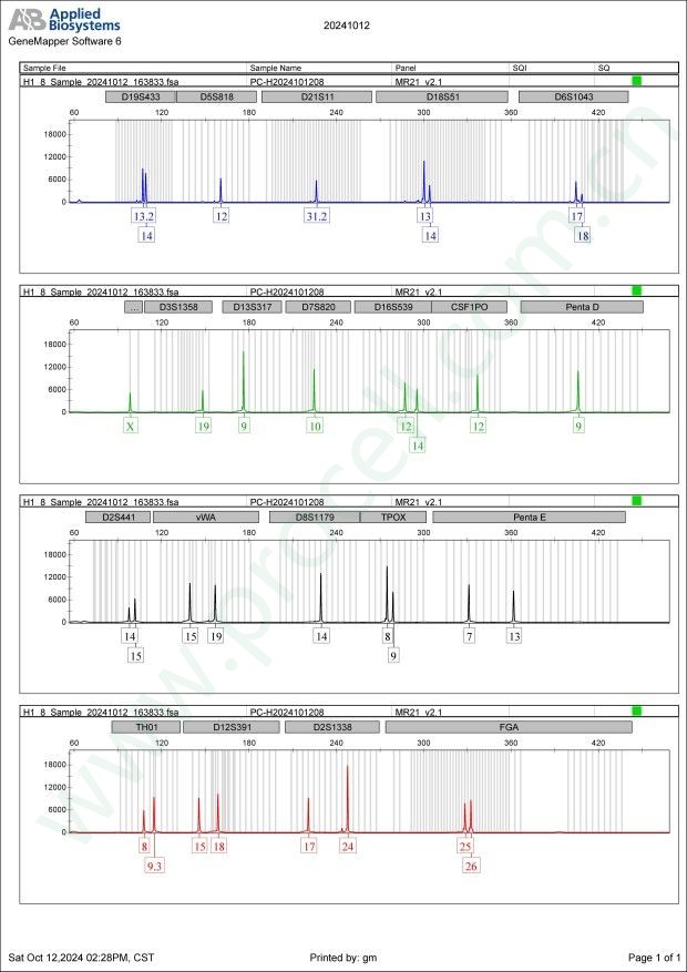 Amelogenin X CSF1PO 12 D2S1338 17,24 D3S1358 19 D5S818 12 D7S820 10 D8S1179 14 D13S317 9 D16S539 12,14 D18S51 13,14 D19S433 13.2,14 D21S11 31.2 FGA 25,26 PentaD 9 PentaE 7,13 TH01 8,9.3 TPOX 8,9 vWA 15,19 D6S1043 17,18 D12S391 15,18 D2S441 14,15 -