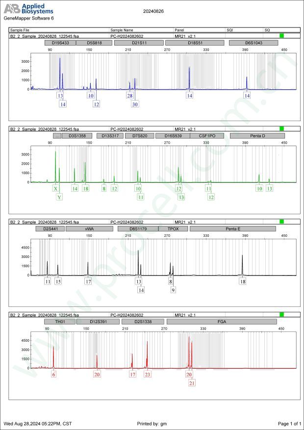 Amelogenin X,Y CSF1PO 11,12 D2S1338 17,23 D3S1358 14,18 D5S818 10,12 D7S820 10,11 D8S1179 13,14 D13S317 8,12 D16S539 12,13 D18S51 14 D19S433 13,14 D21S11 28,30 FGA 20,21 PentaD 10,13 PentaE 18 TH01 6 TPOX 8,9 vWA 17 D6S1043 14 D12S391 20 D2S441 11,15 -