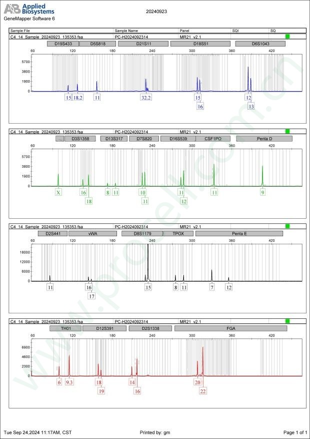 Amelogenin X CSF1PO 11 D2S1338 14,16 D3S1358 16,18 D5S818 11 D7S820 10,11 D8S1179 15 D13S317 8,11 D16S539 11,12 D18S51 15,16 D19S433 15,18.2 D21S11 32.2 FGA 20,22 PentaD 9 PentaE 7,12 TH01 6,9.3 TPOX 8,11 vWA 16,17 D6S1043 12,13 D12S391 18,19 D2S441 11 -