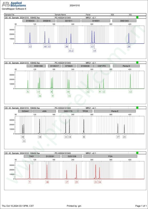 Amelogenin X CSF1PO 9,12 D2S1338 17,25 D3S1358 15,16 D5S818 10,13 D7S820 10,11 D8S1179 11,14 D13S317 8,9 D16S539 12 D18S51 13,15 D19S433 13 D21S11 30,33.2 FGA 21,24 PentaD 12 PentaE 17,21 TH01 7 TPOX 8 vWA 14 D6S1043 20 D12S391 18 D2S441 10,11 -