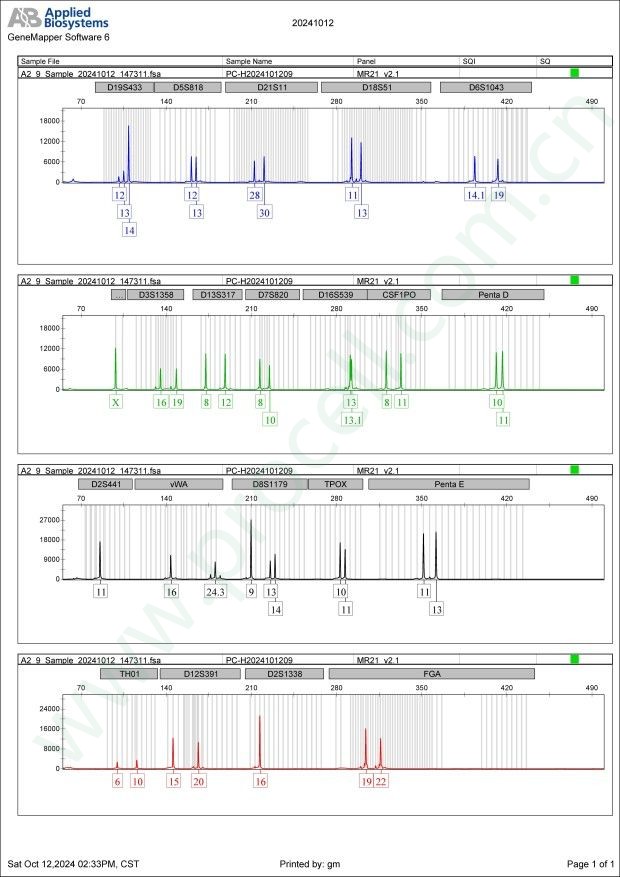 Amelogenin X CSF1PO 8,11 D2S1338 16 D3S1358 16,19 D5S818 12,13 D7S820 8,10 D8S1179 9,13,14 D13S317 8,12 D16S539 13,13.1 D18S51 11,13 D19S433 12,13,14 D21S11 28,30 FGA 19,22 PentaD 10,11 PentaE 11,13 TH01 6,10 TPOX 10,11 vWA 16,24.3 D6S1043 14.1,19 D12S391 15,20 D2S441 11 -