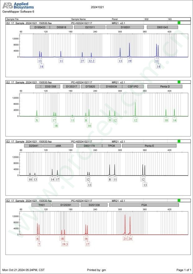 Amelogenin X CSF1PO 12 D2S1338 16,17 D3S1358 17,18 D5S818 11 D7S820 8,10 D8S1179 12,13 D13S317 11 D16S539 9,12 D18S51 13,19 D19S433 13,14 D21S11 27,32.2 FGA 21,24 PentaD 10,14 PentaE 12,13 TH01 6,7 TPOX 8,11 vWA 14,17 D6S1043 13,14 D12S391 18,19.3 D2S441 10,13 -
