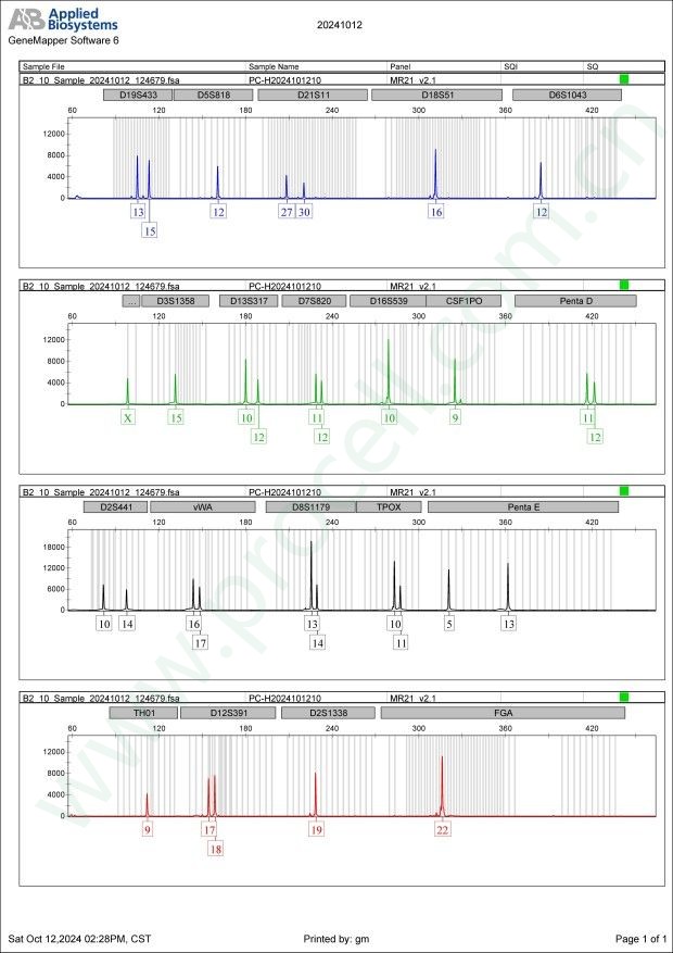 Amelogenin X CSF1PO 9 D2S1338 19 D3S1358 15 D5S818 12 D7S820 11,12 D8S1179 13,14 D13S317 10,12 D16S539 10 D18S51 16 D19S433 13,15 D21S11 27,30 FGA 22 PentaD 11,12 PentaE 5,13 TH01 9 TPOX 10,11 vWA 16,17 D6S1043 12 D12S391 17,18 D2S441 10,14 -