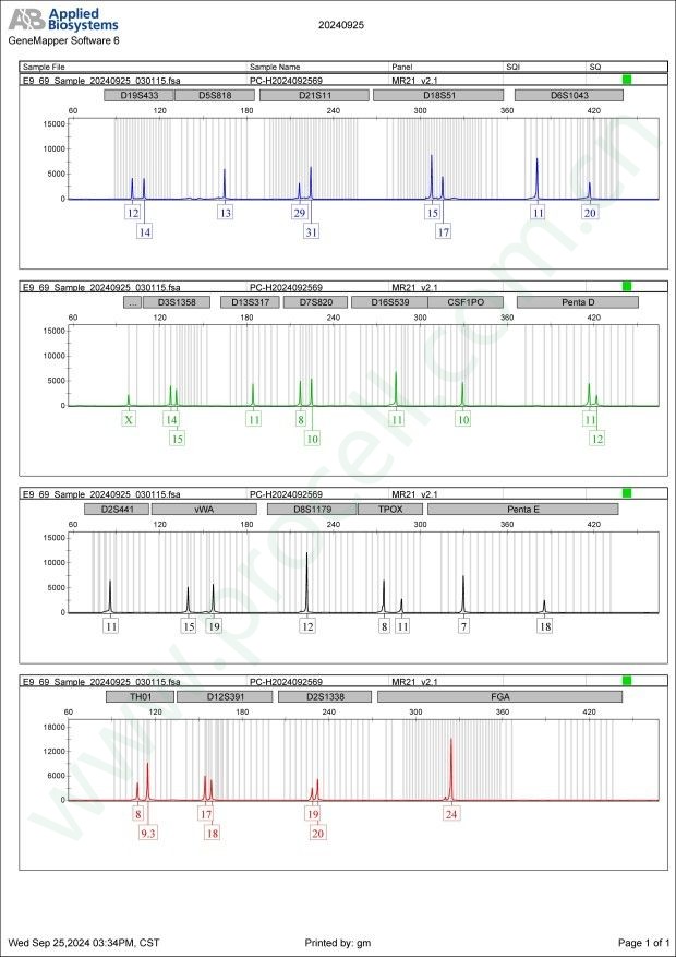 Amelogenin X CSF1PO 10 D2S1338 19,20 D3S1358 14,15 D5S818 13 D7S820 8,10 D8S1179 12 D13S317 11 D16S539 11 D18S51 15,17 D19S433 12,14 D21S11 29,31 FGA 24 PentaD 11,12 PentaE 7,18 TH01 8,9.3 TPOX 8,11 vWA 15,19 D6S1043 11,20 D12S391 17,18 D2S441 11 -