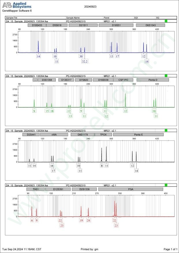 Amelogenin X CSF1PO 12 D2S1338 19,24 D3S1358 15,18 D5S818 10,11 D7S820 9,11 D8S1179 10,11 D13S317 12,13 D16S539 11,12 D18S51 13,17 D19S433 14 D21S11 30,32.2 FGA 22,23 PentaD 10,11 PentaE 12,14 TH01 6,9 TPOX 8,11 vWA 16,17 D6S1043 12,14 D12S391 22,23 D2S441 11,14 -