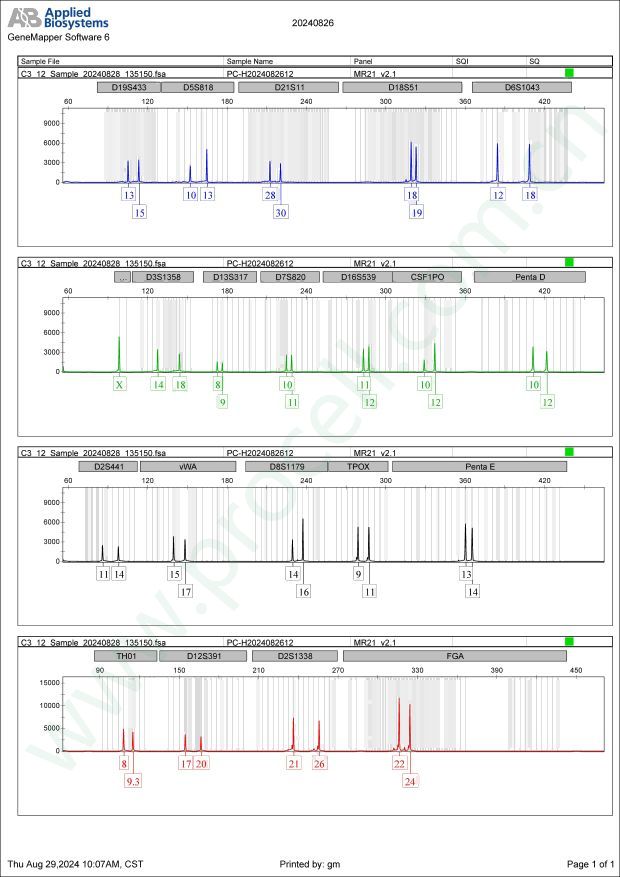 Amelogenin X CSF1PO 10,12 D2S1338 21,26 D3S1358 14,18 D5S818 10,13 D7S820 10,11 D8S1179 14,16 D13S317 8,9 D16S539 11,12 D18S51 18,19 D19S433 13,15 D21S11 28,30 FGA 22,24 PentaD 10,12 PentaE 13,14 TH01 8,9.3 TPOX 9,11 vWA 15,17 D6S1043 12,18 D12S391 17,20 D2S441 11,14 -