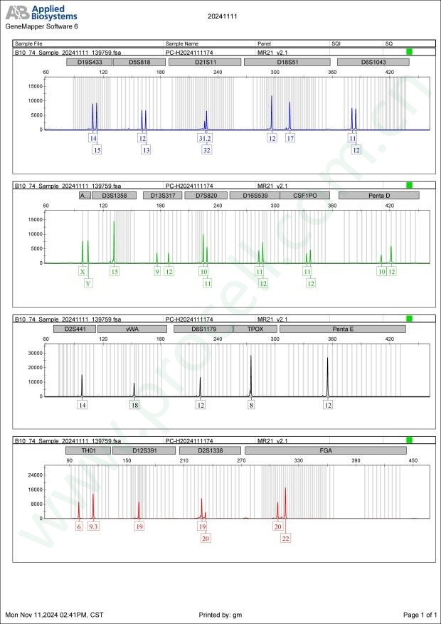 Amelogenin X,Y CSF1PO 11,12 D2S1338 19,20 D3S1358 15 D5S818 12,13 D7S820 10,11 D8S1179 12 D13S317 9,12 D16S539 11,12 D18S51 12,17 D19S433 14,15 D21S11 31.2,32 FGA 20,22 PentaD 10,12 PentaE 12 TH01 6,9.3 TPOX 8 vWA 18 D6S1043 11,12 D12S391 19 D2S441 14 -
