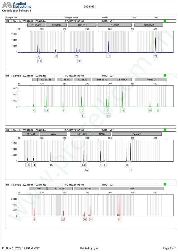 Amelogenin X CSF1PO 11 D2S1338 20,24 D3S1358 15 D5S818 11 D7S820 10,11 D8S1179 14,16 D13S317 9 D16S539 13,14 D18S51 12 D19S433 14,15 D21S11 28,30 FGA 24 PentaD 9,13 PentaE 10,12 TH01 6 TPOX 8,11 vWA 16 D6S1043 21 D12S391 23 D2S441 10,14 -