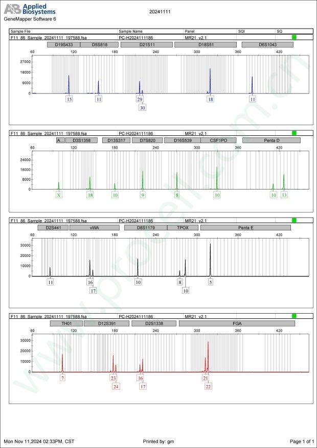 Amelogenin X CSF1PO 10 D2S1338 16,17 D3S1358 18 D5S818 11 D7S820 9 D8S1179 10 D13S317 10 D16S539 8 D18S51 18 D19S433 15 D21S11 29,30 FGA 21,22 PentaD 10,13 PentaE 5 TH01 7 TPOX 8,10 vWA 16,17 D6S1043 11 D12S391 23,24 D2S441 11 -