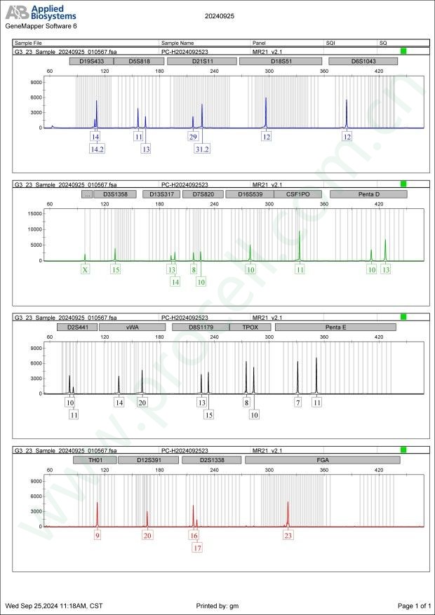 Amelogenin X CSF1PO 11,12 D2S1338 20,22 D3S1358 18 D5S818 11,13 D7S820 9,12 D8S1179 13,15 D13S317 11,13 D16S539 9 D18S51 10,14 D19S433 12,14 D21S11 28,29,30 FGA 22,23 PentaD 9,11 PentaE 7,11 TH01 7 TPOX 8 vWA 14,15 D6S1043 11,21 D12S391 23,25 D2S441 10,14 -
