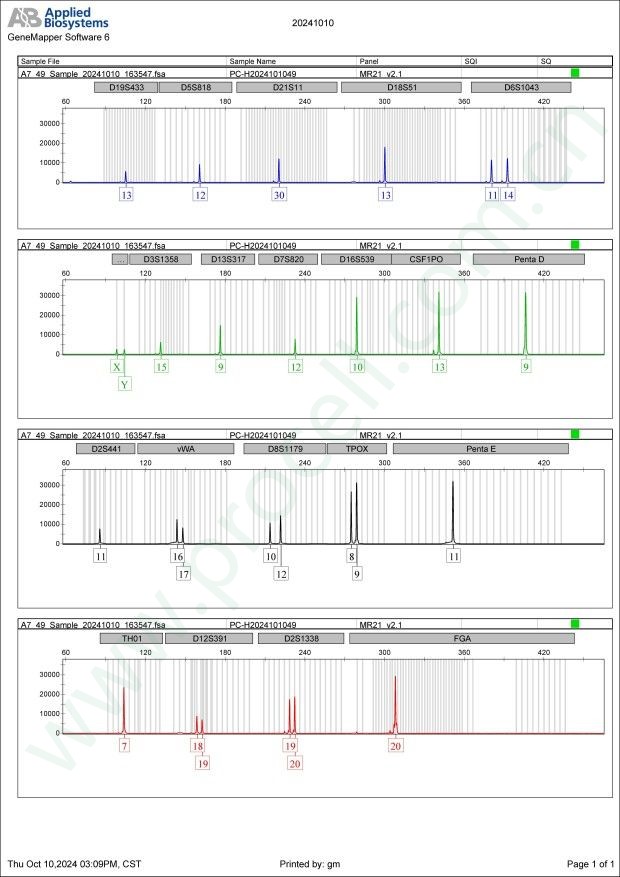 Amelogenin X, Y CSF1PO 13 D2S1338 19,20 D3S1358 15 D5S818 12 D7S820 12 D8S1179 10,12 D13S317 9 D16S539 10 D18S51 13 D19S433 13 D21S11 30 FGA 20 PentaD 9 PentaE 11 TH01 7 TPOX 8,9 vWA 16,17 D6S1043 11,14 D12S391 18,19 D2S441 11 -